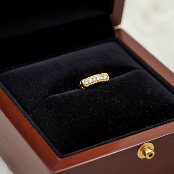 This exquisite American Diamond nose pin features a brilliant, ethically-sourced diamond set in a sleek, minimalist design. Its shimmering facets catch the light beautifully, adding a touch of elegance to any look. Crafted from 18k Traditional Gold, this nose pin is both durable and stylish, perfect for everyday wear or special occasions.